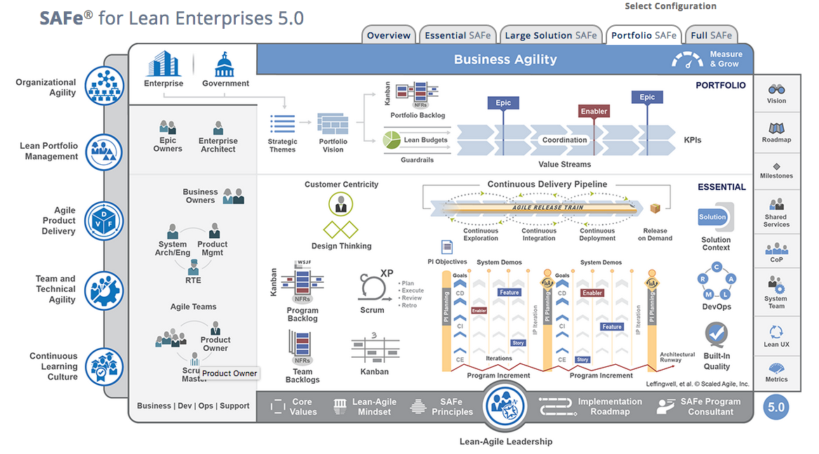 With the “portfolio” configuration, you have an additional level of “lean portfolio management” (LPM) whose goal is to « align strategy, funding and execution ». This adds epic owners, enterprise architects, lean business cases, KPI and the like the framework. According to the framework, only with this configuration can you achieve business agility. Something I like with SAFe is that idea to fund value streams rather than projects.